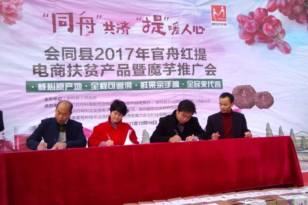同舟共济 提暖人心 会同县2017官舟红提电商扶贫暨魔芋产品推介会 为打造农产品电商供应链,畅通农产品上行渠道,12月16日上午9:30,由会同县人民政府主办,神州买卖提电子商务有限公司协办的会同县2017年官舟红提电商扶贫暨魔芋产品推介会在会同县官舟村拉开帷幕。 此次活动,神州买卖提电子商务有限公司携手湖南博嘉魔力农业科技有限公司、会同县民泰葡萄种植合作社,通过线上网销、网红直播等手段,深挖“君谐”魔芋、“张葛老”葛粉等特色地方品牌,为会同县农产品上行开拓了全新渠道。 活动现场,神州买卖提作为电商扶贫企业代表,与民泰葡萄种植合作社签订扶贫合作协议,将利用电商渠道、品牌打造、全网营销等方式助力官舟红提网销全国。 活动期间,神州买卖提联手星米文化传媒特邀花椒直播平台两位当红主播深入活动现场,对会同县“官舟红提”“君谐魔芋”等产品进行细致详细讲解,共吸引40余万粉丝观看。产品通过会场与京东、苏宁易购、淘宝网等平台同步直播销售,并在会同城区线下销售。 会同县为2016年全国电子商务进农村综合示范县,依托丰富的产品资源、独特的地域位置、良好的基础设施和强大的工作团队,聚焦、聚神、聚力于农村电商发展工作:以信息进村和“互联网+”为实现途径,在县城设立电商运营中心、各乡镇设立片区服务中心、各村设立民生电商服务站;以信息技术的“最优一公里”打通服务基层群众的“最后一公里”,向上对接各涉农部门和企业各项服务,向下承接村民各类需求,着力实现农村民生电商服务信息化、社会化、市场化。 神州买卖提将继续携手会同县政府,让当地百姓足不出村就把农副产品网销全国,实现“人来人往”向“网上来往”转变,让更多的会同山货变身“网红”,走出会同,走向全国!