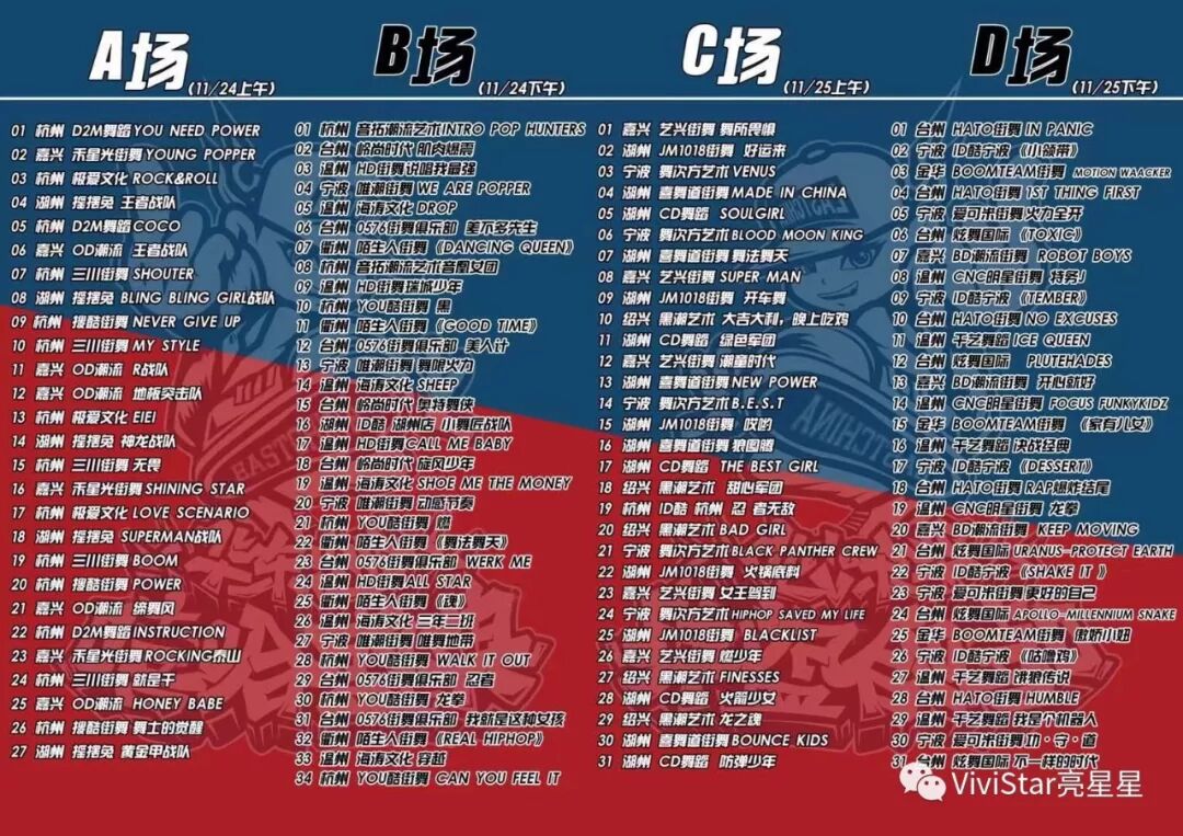 赛事分布:覆盖浙江杭州,温州,台州,金华,衢州,嘉兴,绍兴,宁波,湖州九大城市,中国舞蹈家协会街舞委员会浙江街舞协会直接管理的91家少儿艺术机构同时启动,共计100余场赛事,打造华东最具影响力儿童赛事品牌。