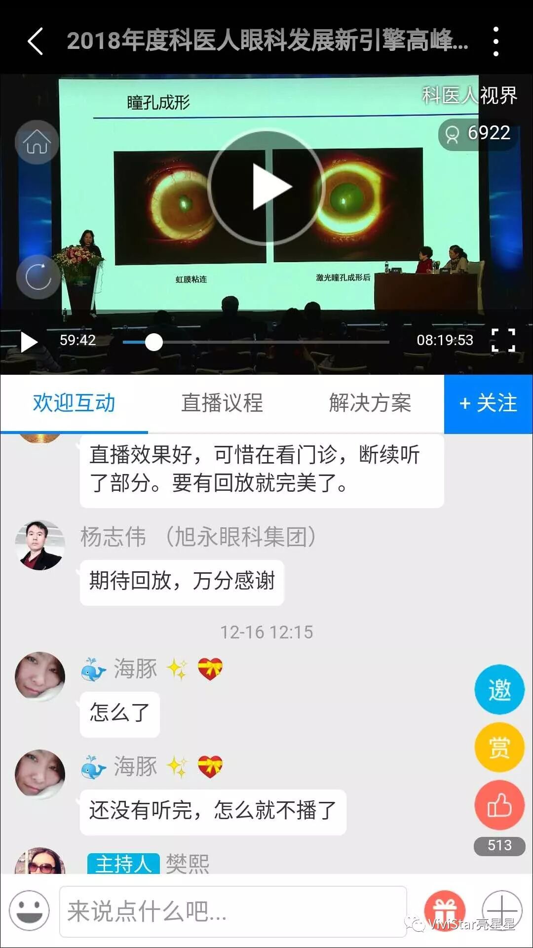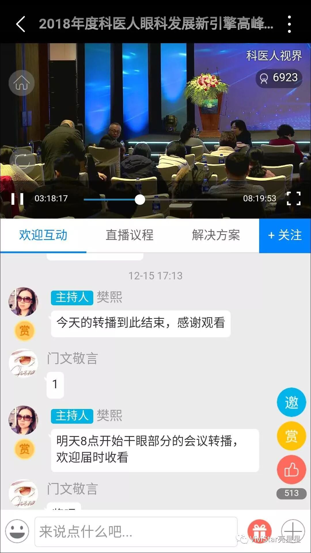活动简介:2018年度科医人眼科发展新引擎高峰论坛已于12月15-16日举行。届时来自全国的眼科专家及科医人眼科用户将齐聚一堂,共同探讨眼科新技术的应用及发展方向。星米文化传媒全程承担此次活动现场直播工作,本次论坛会场采用单机位直播,直播网络采用4G多卡聚合,1080高清信号直播;中间有一个医院手术治疗的互动环节,就是将上海华山医院手术治疗过程实时转播到会场,会场的教授专家与医院的医生进行讲解互动。本次互动直播,医院的视频信号通过卫星信号传输到会场,最大的特点是无延时,声音无损传输保真度高。