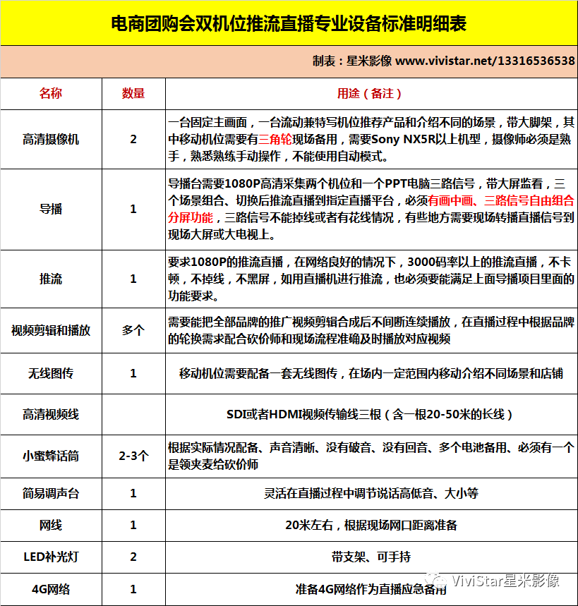 根据企业情况找个环境安静的地方做装饰,背景板,现场布置等,空间至少在16平方米以上,根据实际情况尽量大些,25平方米以上为佳。 大致按照上面表格内的设备进行直播设备配置,可以进行正常的直播,可以在直播过程中做些简单包装,如放广告片,放图片,放角标Logo,放音乐效果,放字花字幕等。 预计很多企业会有远程连线异地互动的需求,只要在这套设备上简单增加部分软硬件即可完成。 现场准备上行30M的有线网络,最好是固定IP固定上传带宽,如果需要远程连线或多地互动,对下行也有要求。 根据企业条件和需求增加返看显示、提词器、实时耳返等其他设备。 每天直播的内容可以剪辑成精彩花絮短片做推广和给客户观看。 以上设备就是市场专业级设备即可,不需要广电局级别的设备,但是也是需要安排专业执行团队进行执行操作的。